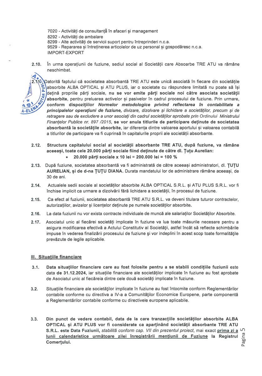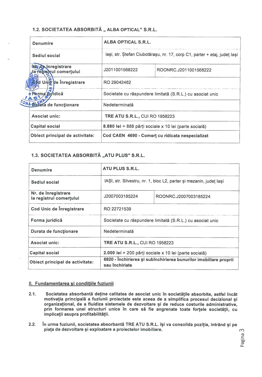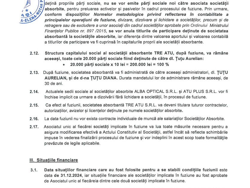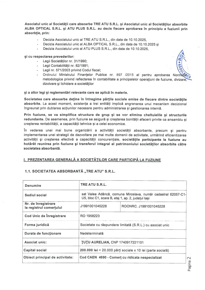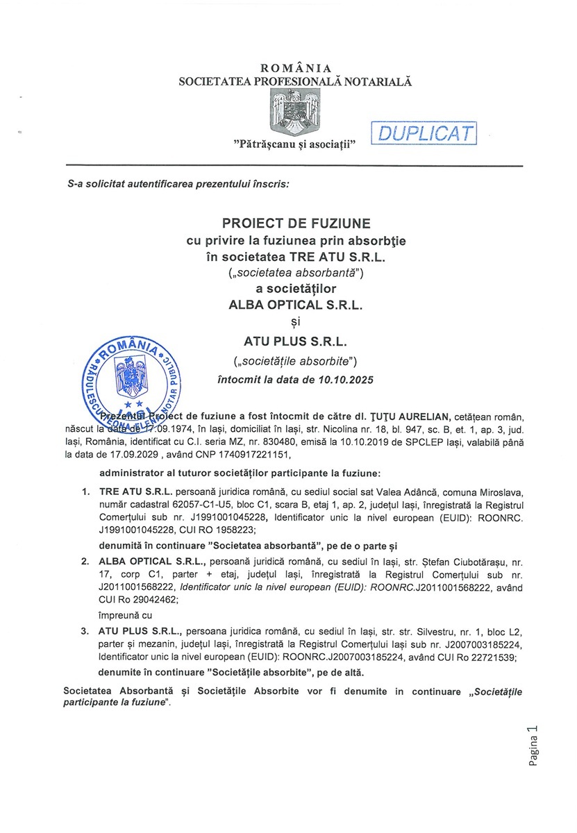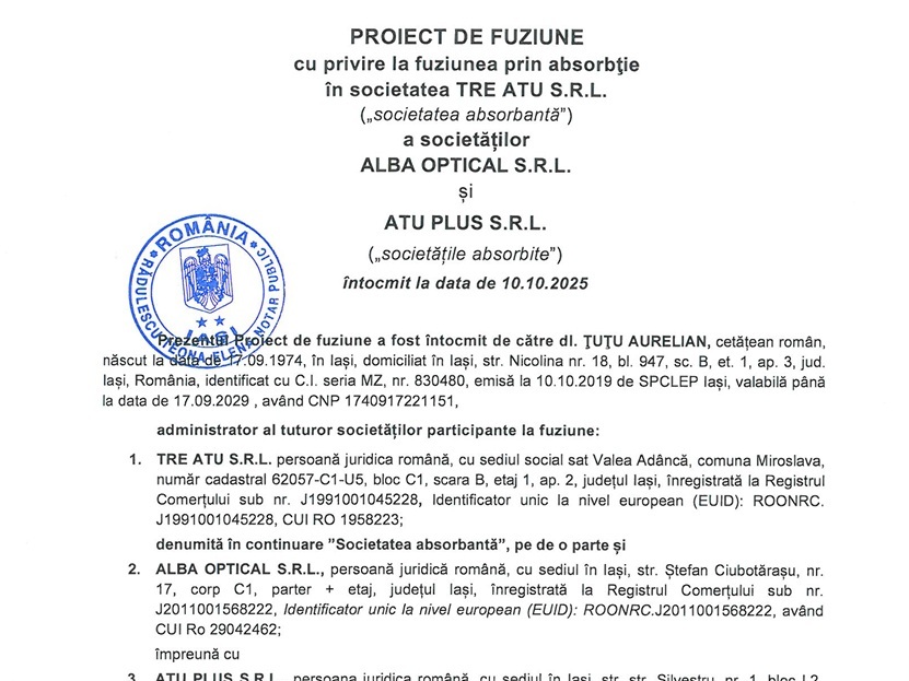 Anunț de interes public: PROIECT DE FUZIUNE din 10.10.2025 Societate absorbantă – TRE ATU S.R.L. Societate absorbită 1 – ALBA OPTICAL S.R.L. Societate absorbită 2 – ATU PLUS S.R.L.
