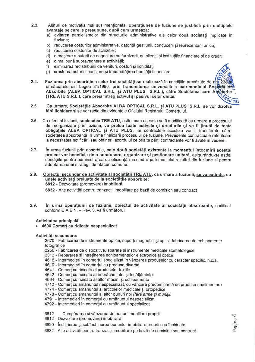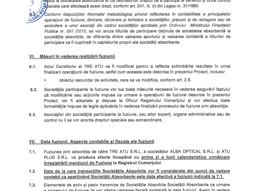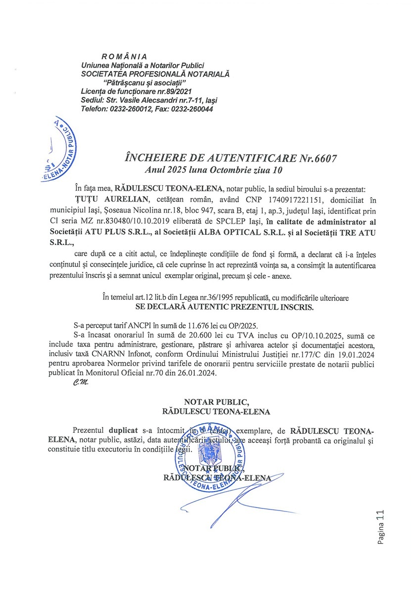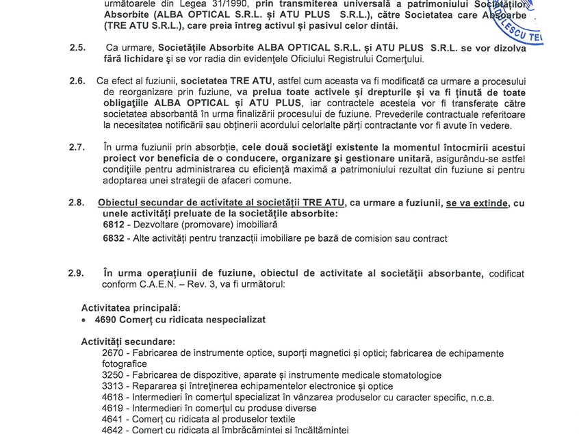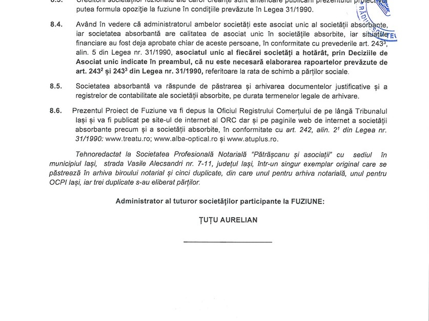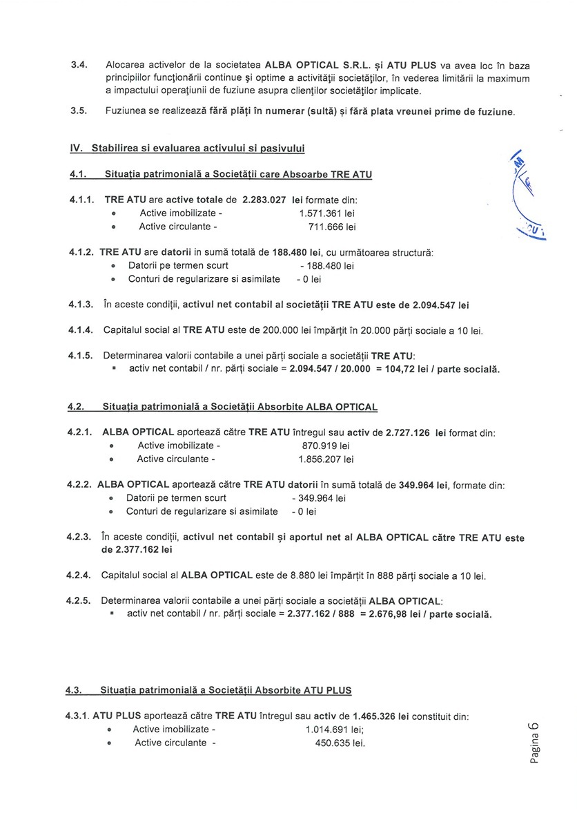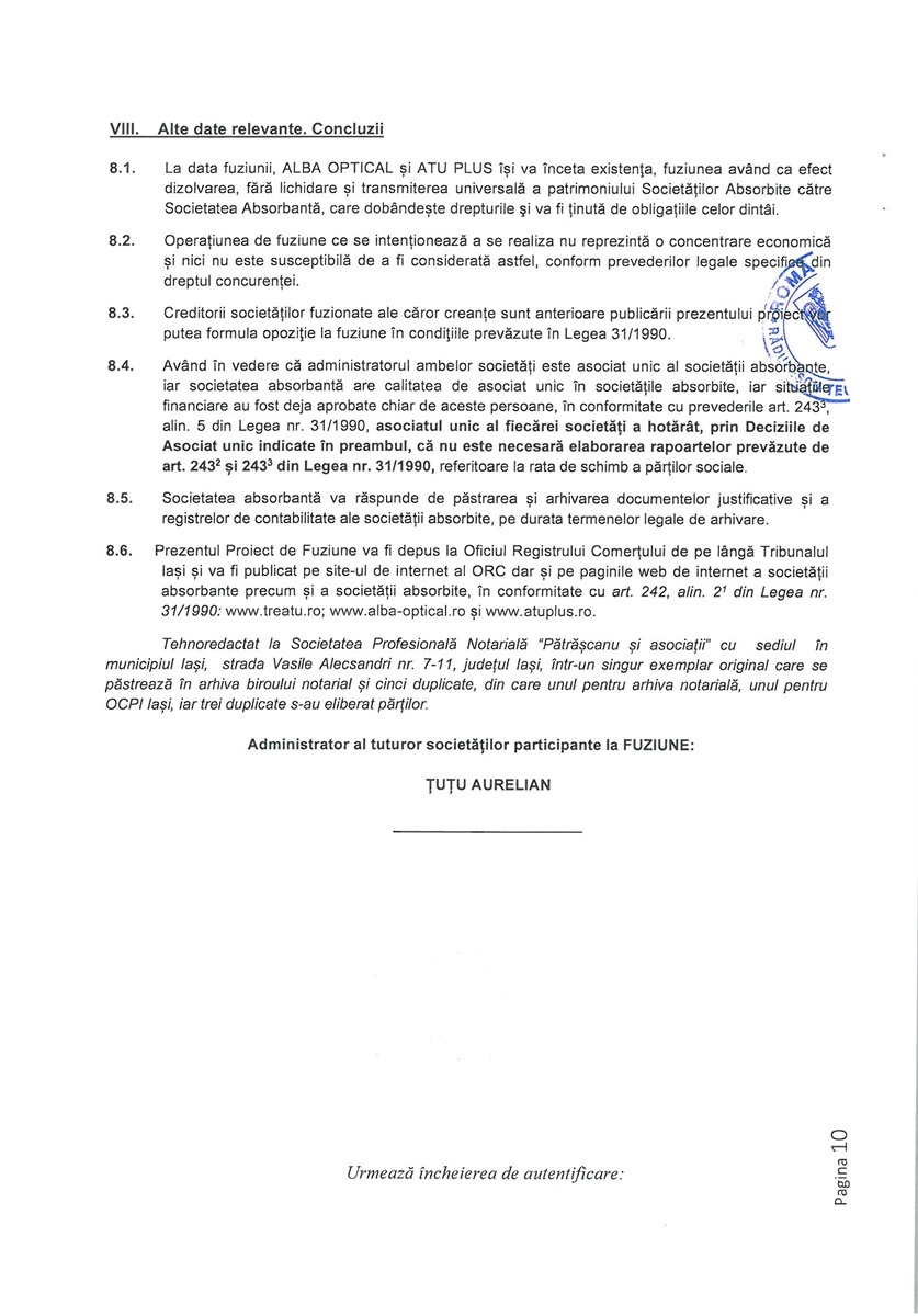 Anunț de interes public: PROIECT DE FUZIUNE din 10.10.2025 Societate absorbantă – TRE ATU S.R.L. Societate absorbită 1 – ALBA OPTICAL S.R.L. Societate absorbită 2 – ATU PLUS S.R.L.